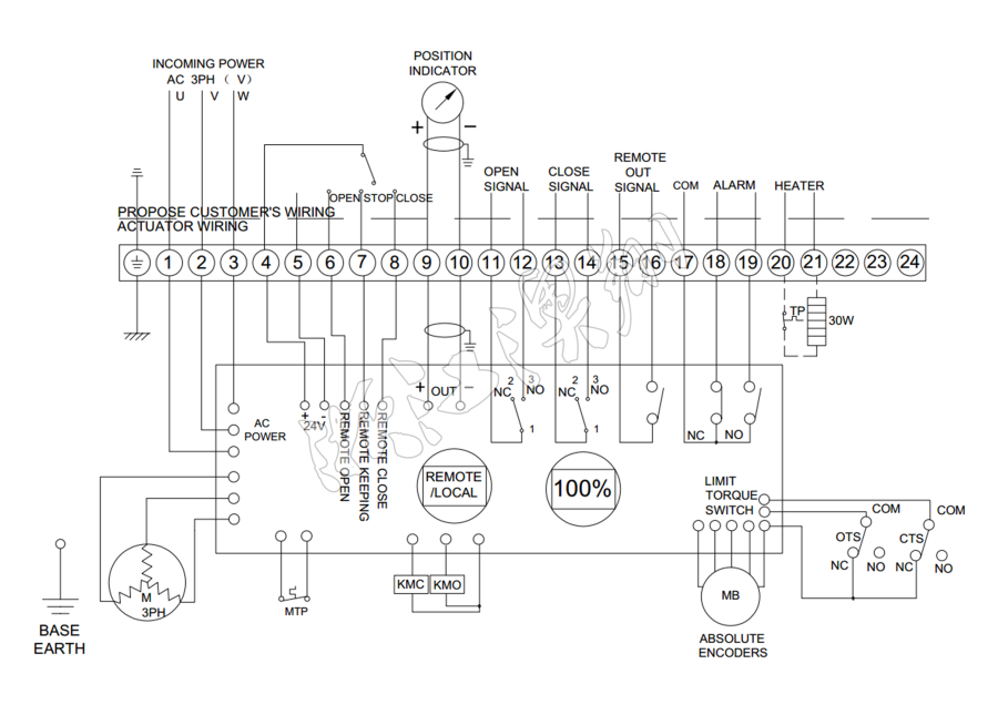 控制線路符合單相或三相電源標(biāo)準(zhǔn),線路布置緊湊合理。執(zhí)行器采用葵花端子配置29個(gè)接線端口,雙密封連接時(shí)端子臺(tái)安裝于執(zhí)行器腔體和連接器之間。即使在取下外蓋后或是電纜封套沒有完全密封的情況下,也可保護(hù)設(shè)備免于塵土或濕氣的侵害。接線端子可有Xiao滿足各種附加功能的要求。(可根據(jù)客戶要求另行加工)